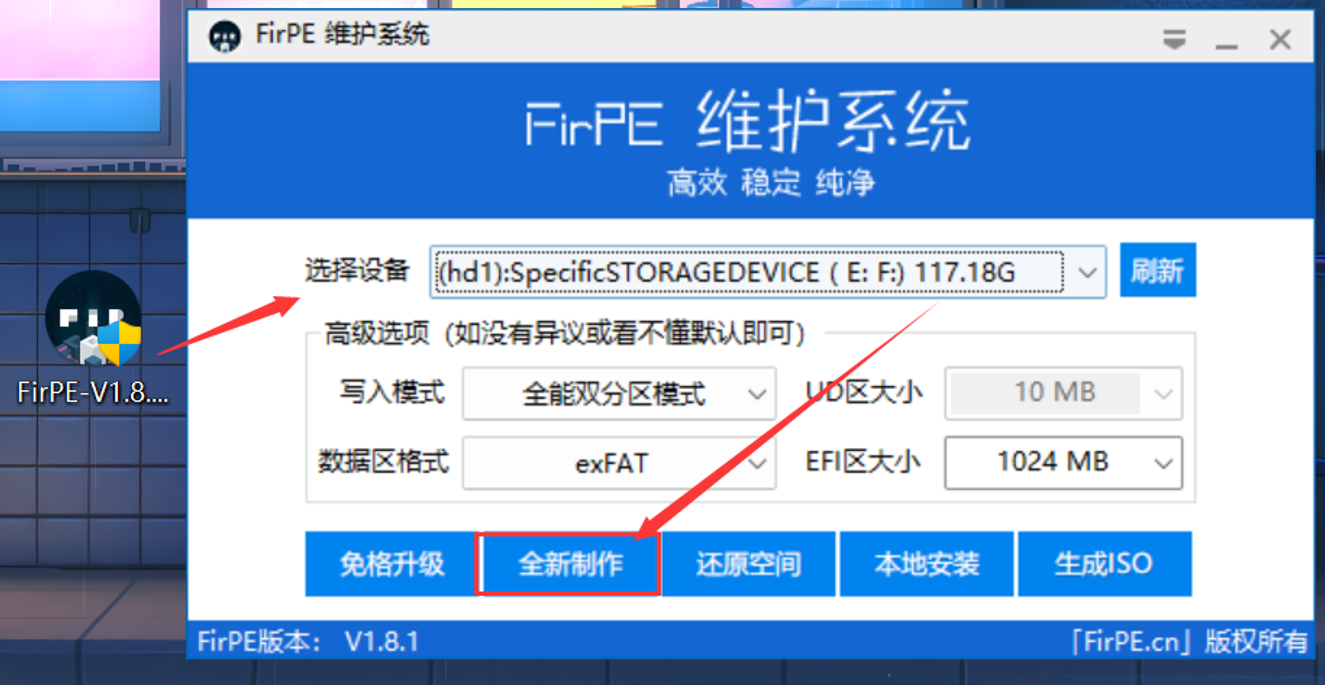 下载成功后,将准备好的U盘插入电脑,双击运行打开维护系统,选择全新制作即可,其余的不用改
