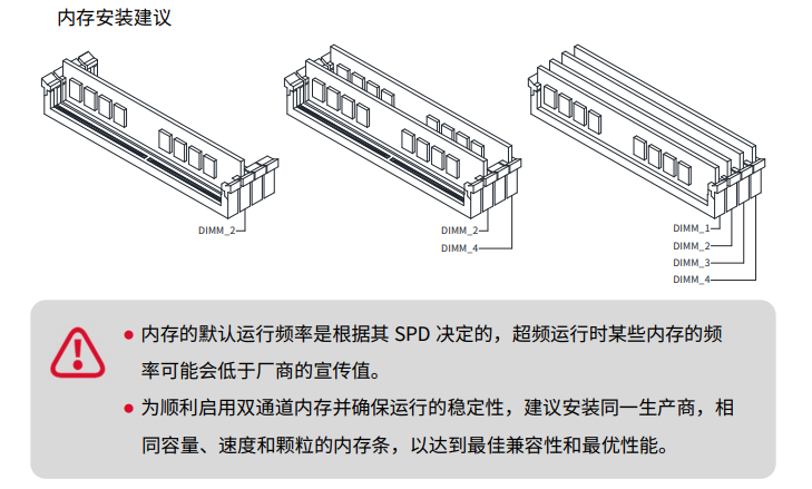 有4条内存插槽的主板,建议使用同品牌、同频率、同容量内存,内存插槽安装建议: