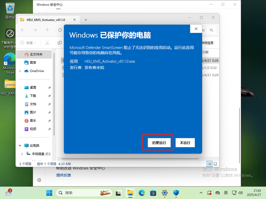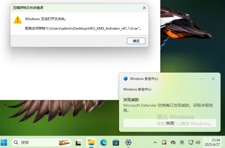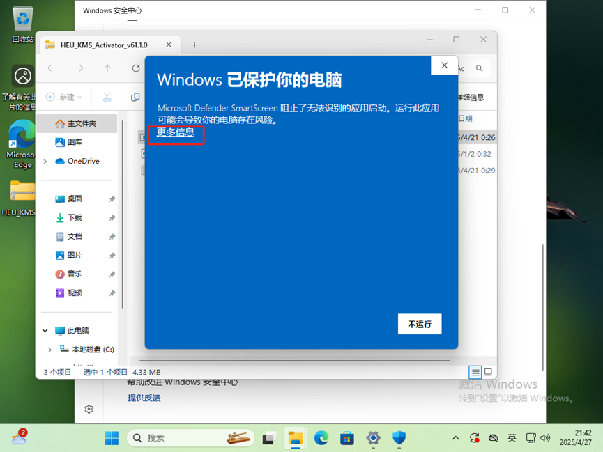 在双击运行之后,发现被windows安全中心提示,发现威胁,被杀毒软件自动删除了,这时该怎么办呢?我们双击“发现威胁”。