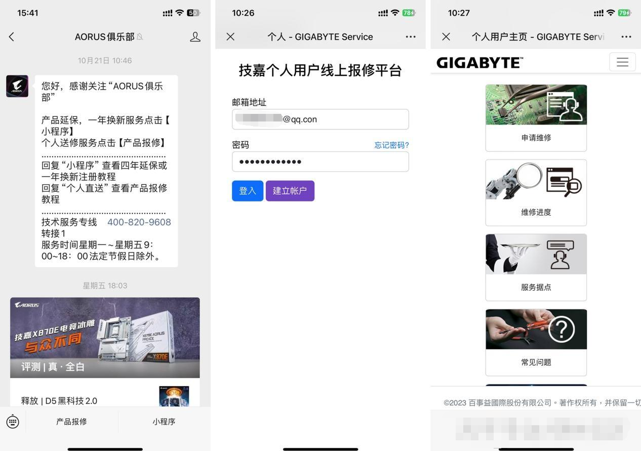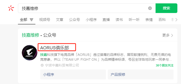 1.在微信上搜索:技嘉维修,弹出的就是AORUS俱乐部,下方就有产品报修选项。