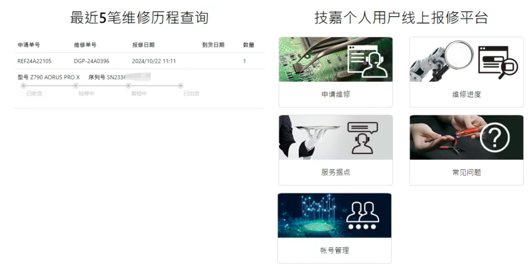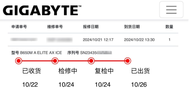 5.填写完成后到主页面还可以看到该主板的维修进度,有收货、检修、复检、出货几个过程。
