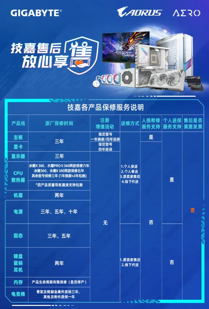 支持个人送保的产品线有:主板、显卡、显示器、CPU散热器、机箱、电源,其他产品只能通过经销商送保