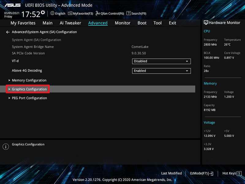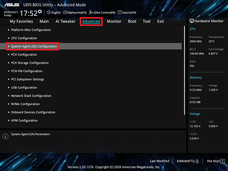 3. 点选 [Advanced]页面并点选[System Agent (SA) Configuration]选项