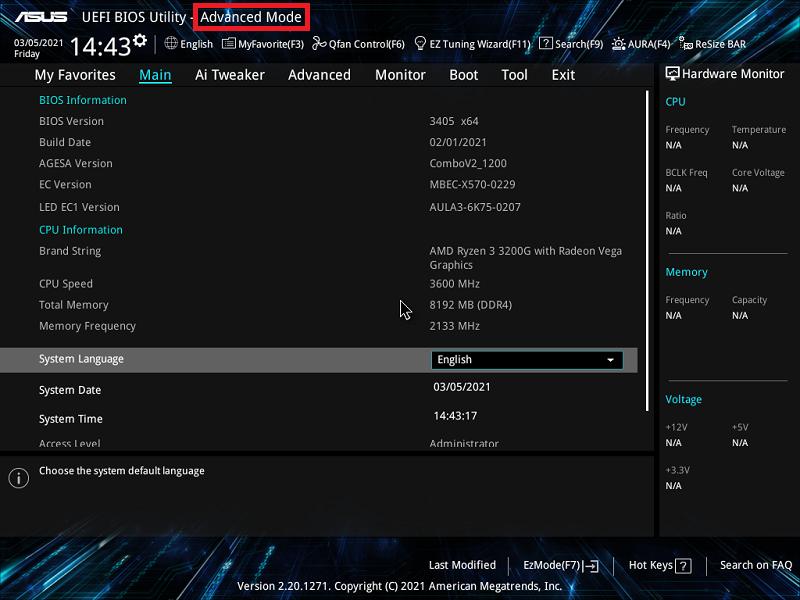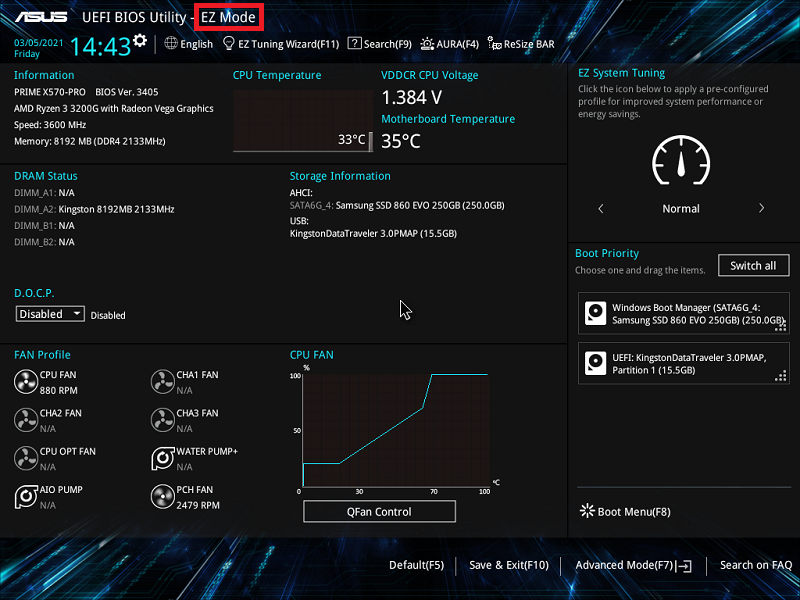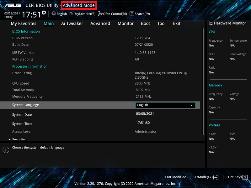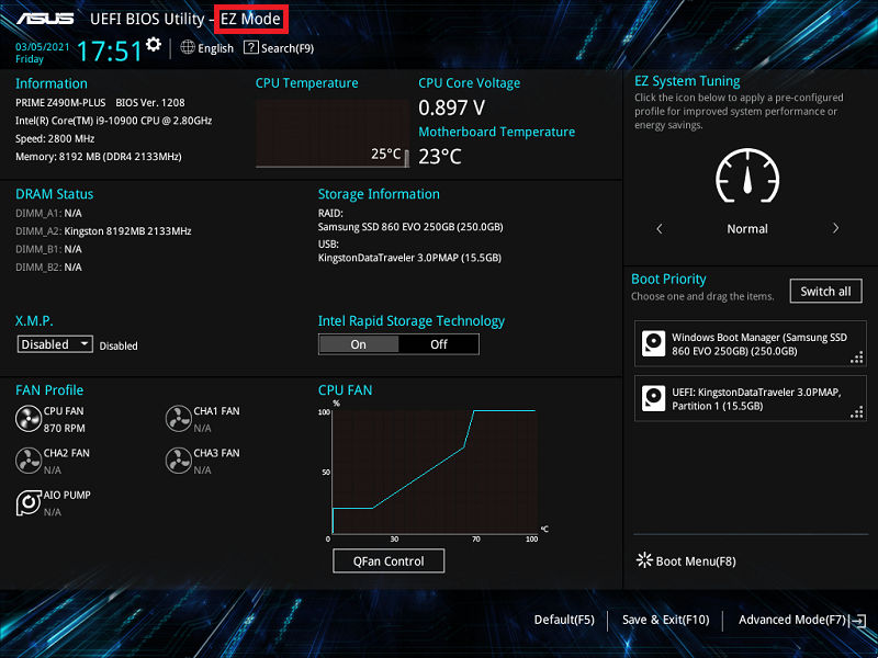 1. 按电脑开机键后,立即连续按键盘上的“delete”键,进入BIOS [EZ Mode]