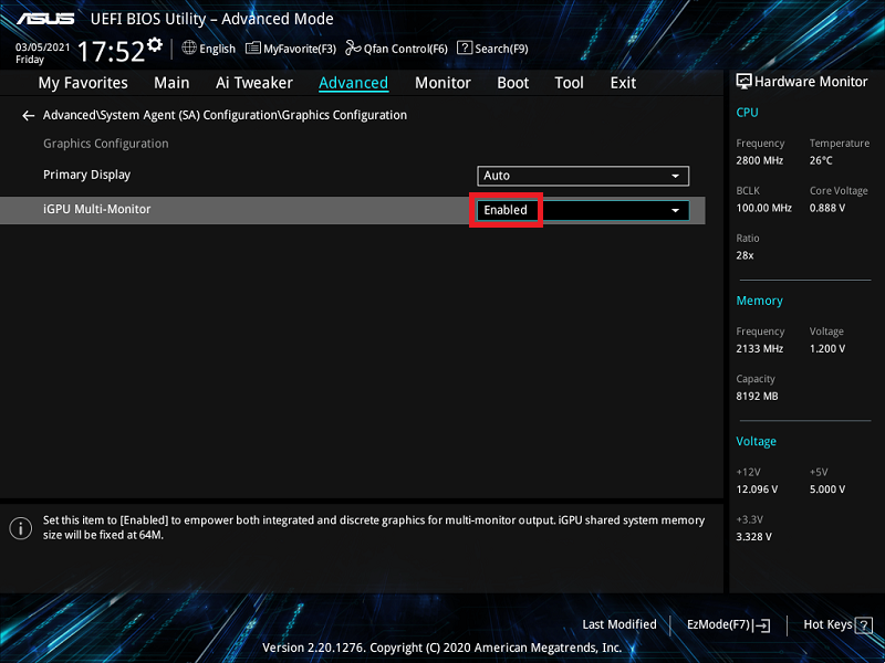 4. 点选[IGFX Multi-Monitor]选项并设置为[Enabled]开启,想要关闭则设置为[Disabled]