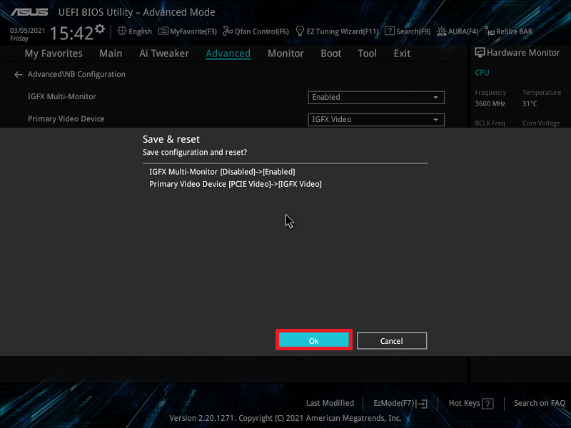 5. 按键盘F10键,点选Ok,保存选项,计算机重启