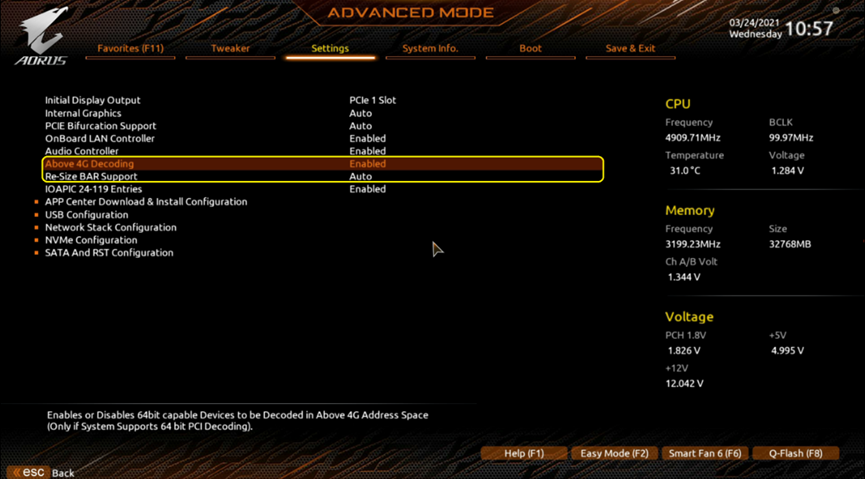 第一步 : BIOS → Advanced Mode → Settings → Above 4G Decoding,选择 “Enabled”