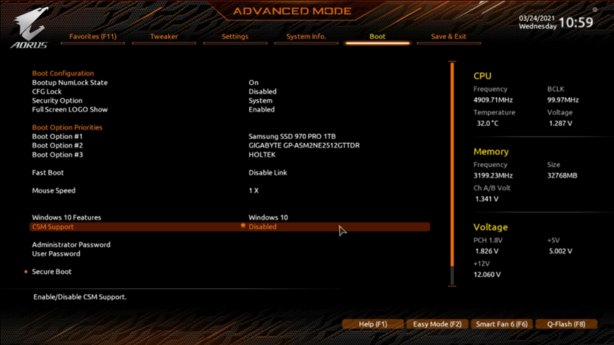 第三步 : BIOS → Advanced Mode → Boot → CSM Support,选择 “Disabled”