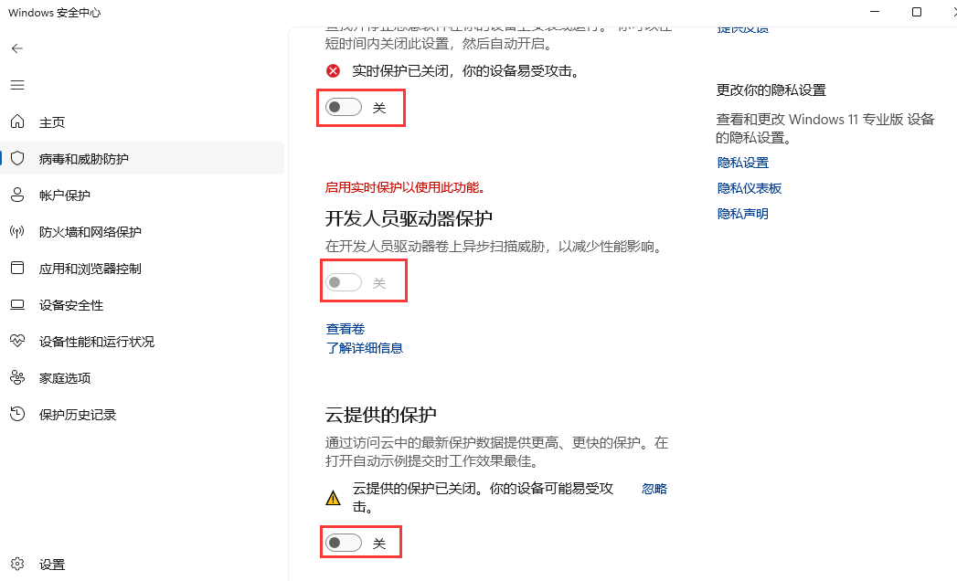 2、将实时保护、开发人员驱动器保护、云提供的保护3个选项都关闭