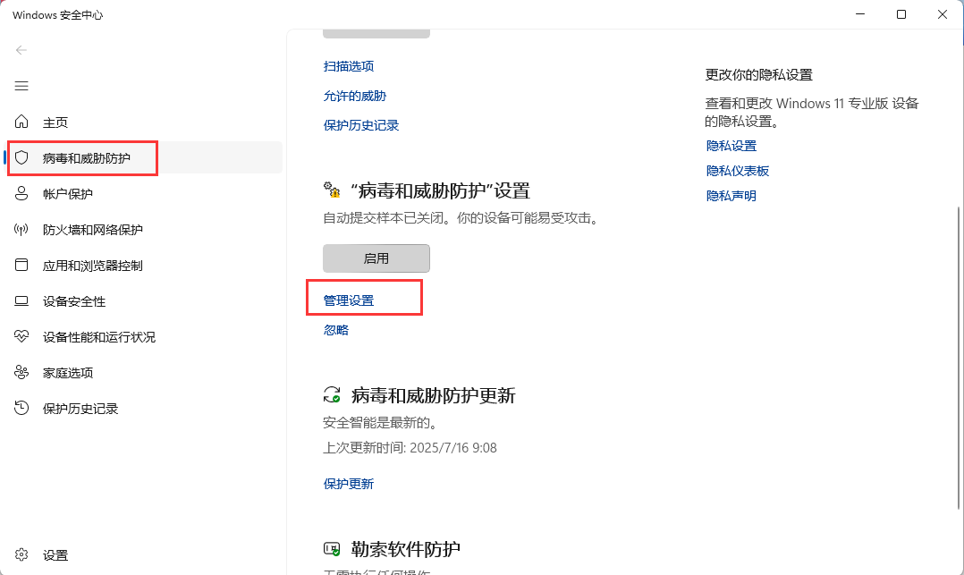 1、需要先手动关闭 Windows安全中心,在病毒和威胁防护 - 找到管理设置