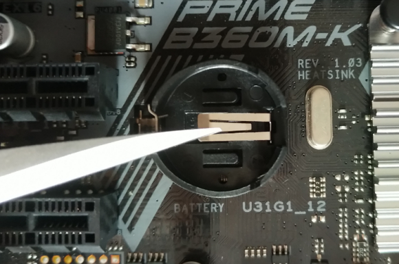 3. 向外抠动CMOS电池边上的卡扣移除电池,使用金属将底座正负极连接5~10秒