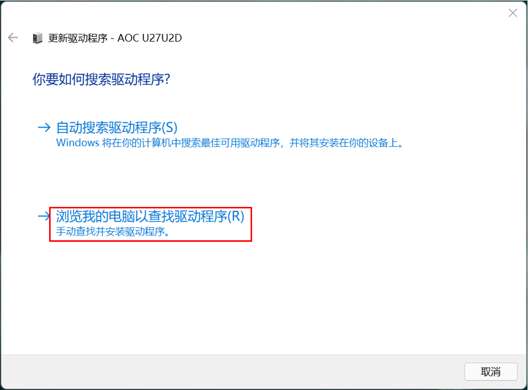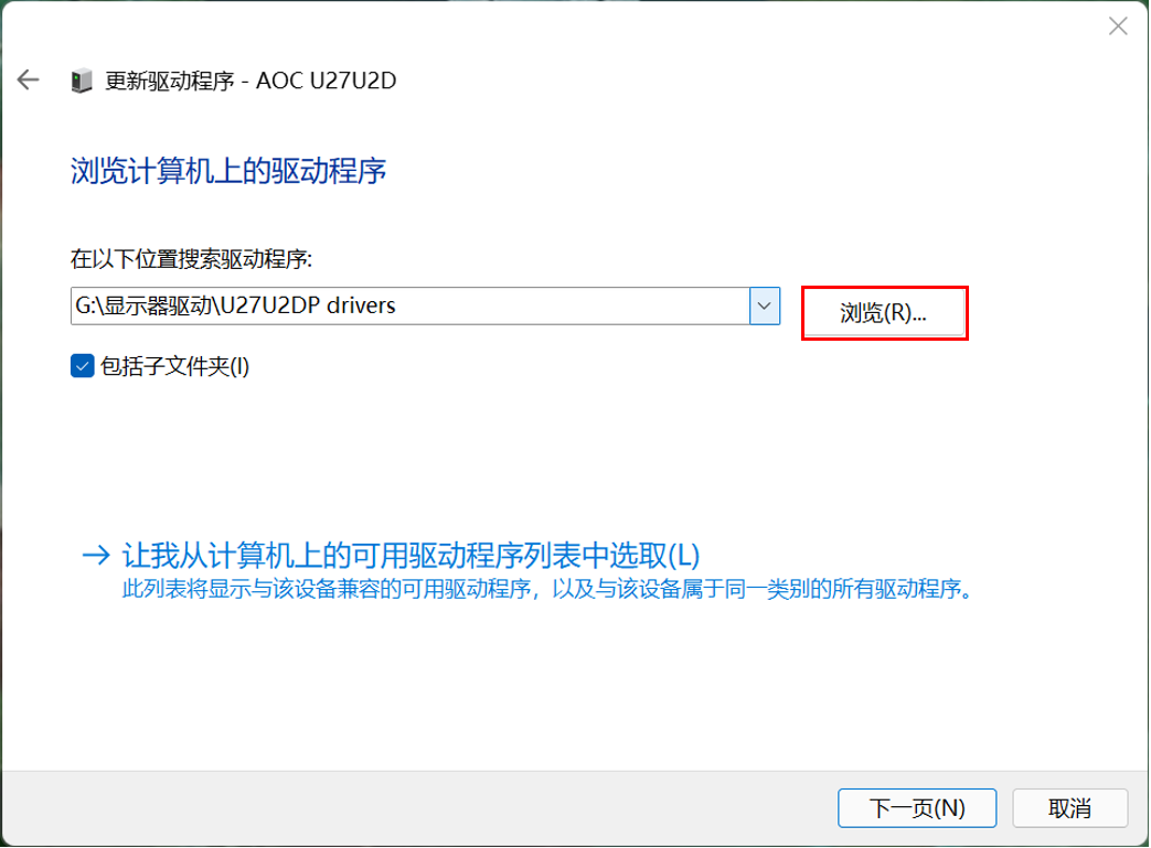 二、安装显示器驱动程序,现以Windows 11及 AOC U27U2DP机型为例说明: