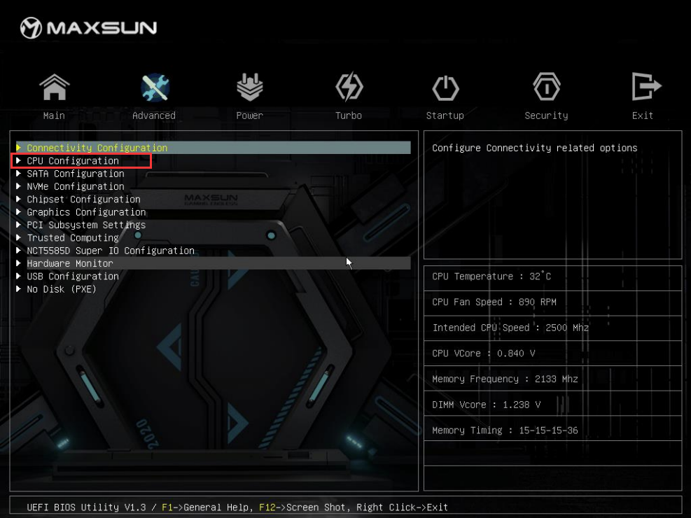 2、在 BIOS中,在顶部选择" Advanced”(高级)选项,然后点击进入”CPU Configuration “设置